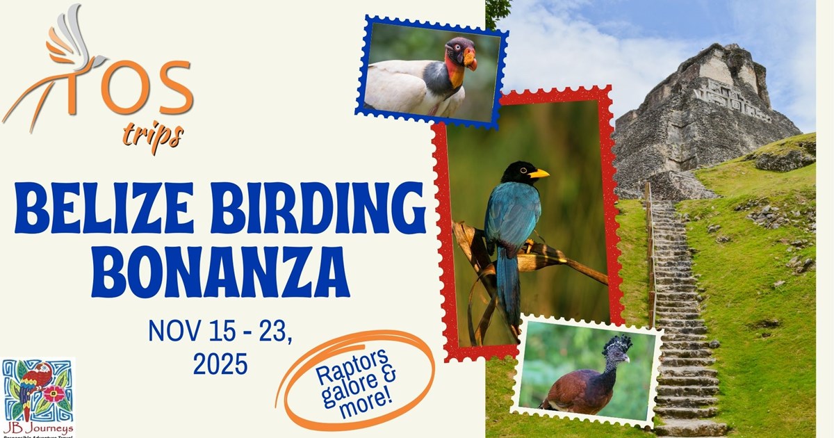 TOS is planning to host a second trip to Belize, a beautiful English-speaking country in Central America that has a rich tropical avifauna and a culture heavily influenced by the Mayan civilization. Byron Stone will lead this 8-night, 9-day TOS trip during peak raptor migration in November 2025.