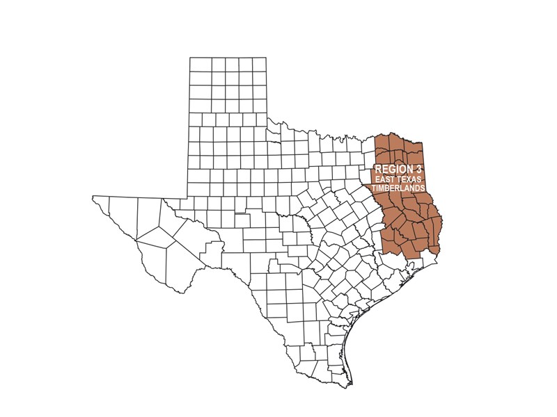 Shut your eyes and imagine rolling hills with different shades of majestic green trees (even in winter). With an average of 46 inches of rainfall, we’re also known fondly as the rain forest of Texas! Region 3 encompasses from Orange to Texarkana, then from the Louisiana border to Interstate 45, a total of 46 counties.