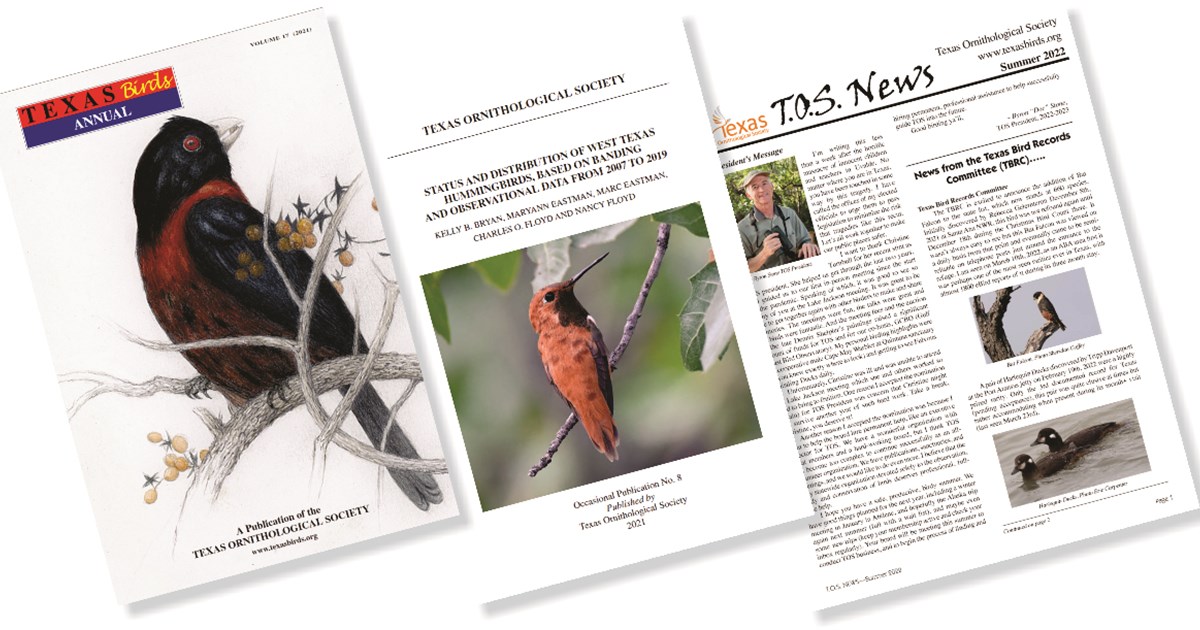 Bulletin of the Texas Ornithological Society is an annual journal that publishes research reports and short communications in the field of ornithology. Articles cover a wide range of topics including interpretations of laboratory and field studies, historical perspectives on Texas ornithology and developments in theory and methodology.
